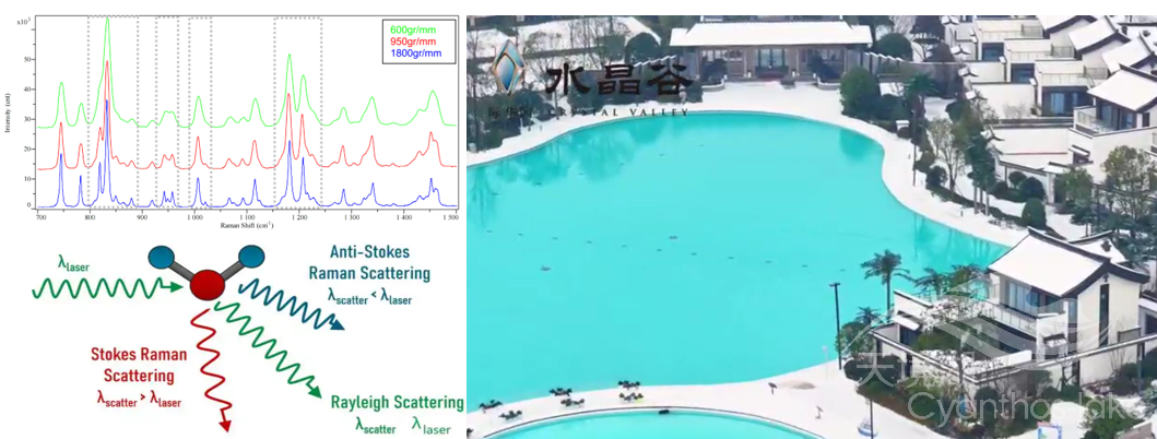 拉曼效应是指水分子中的散射,当水较浅时,大部分光线都可以透射,所以水看起来是透明的;当水的深度增加时,波长较长的红光、橙光和黄光会最先被水吸收,由于绿光在水中的散射能力较强且不易被吸收,因此使得湖水看起来是绿色的。再深广的海水,是波长较短的蓝、紫色泽散射出来,形成了大海的蔚蓝。